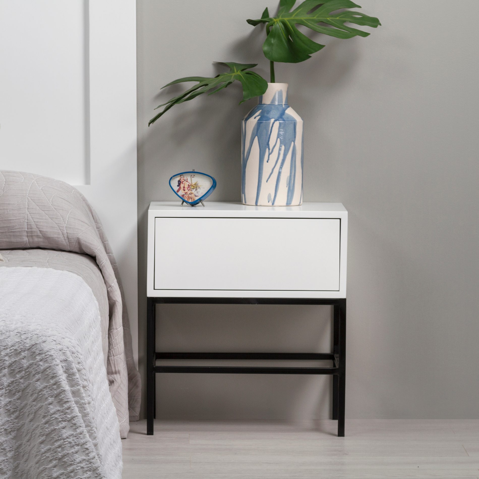 Mesita Push 1 cajon lacado blanco con estructura metálica